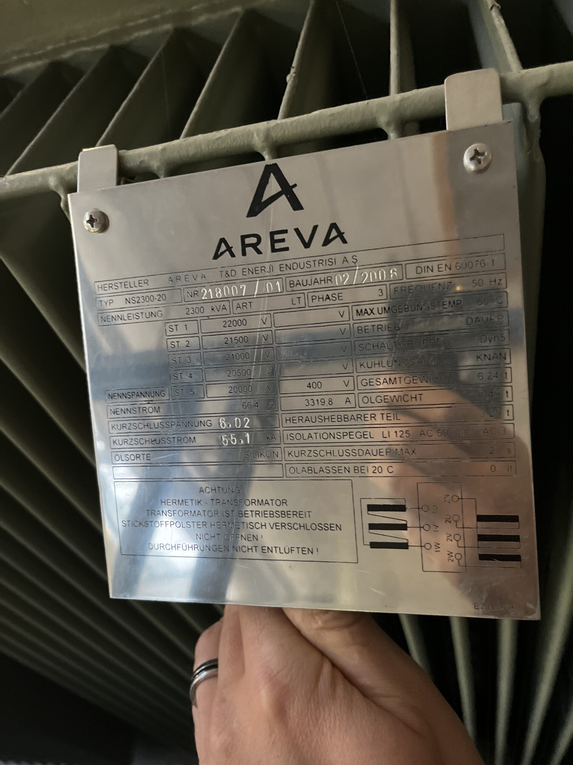 Enercon E – 70 E4 Transformator, Hersteller Areva, 2300 KVA, 20 / 0,4 KV, 3 – Phasig, gebraucht